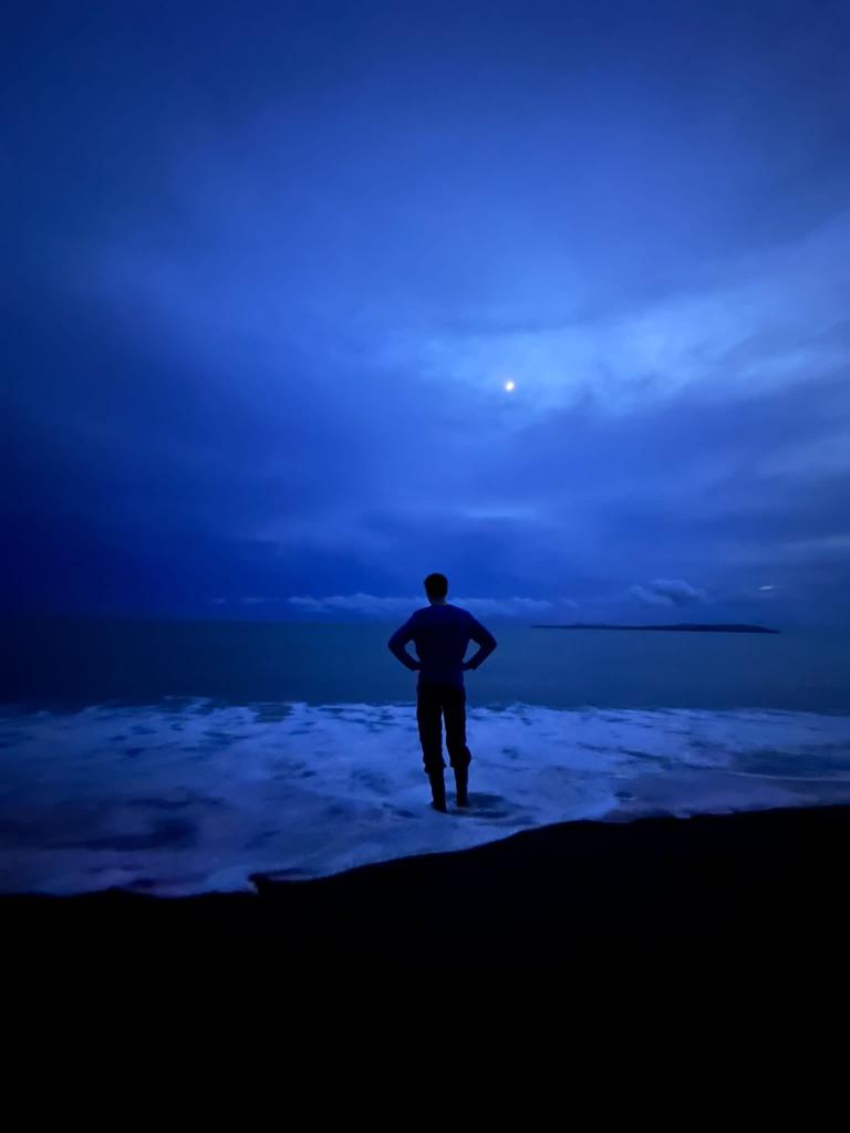 John stands at Playa Malena, a beach where Olive Ridley sea turtles come to lay eggs, while a storm brews off the coast on this atmospheric night.